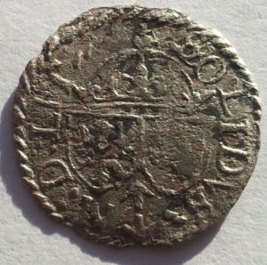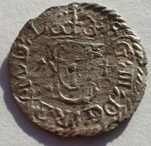 Szeląg litewski Zygmunt Waza, Wilno 1626Av.: Ukoronowany monogram królewski „S”, na nim Snopek Wazów. Napis w otoku: SIG III D G REX PO M D L. Rv.: Dwie tarcze z herbami Polski i Litwy, nad nimi korona (typ 2). Poniżej Wadwicz, herb Krzysztofa Naruszewicza podskarbiego wielkiego litewskiego. Napis w otoku: SOLIDVS M – D LITV (przebitka 1/V) 1626. Odwrócona 2 w dacie, przebitka 6/1.