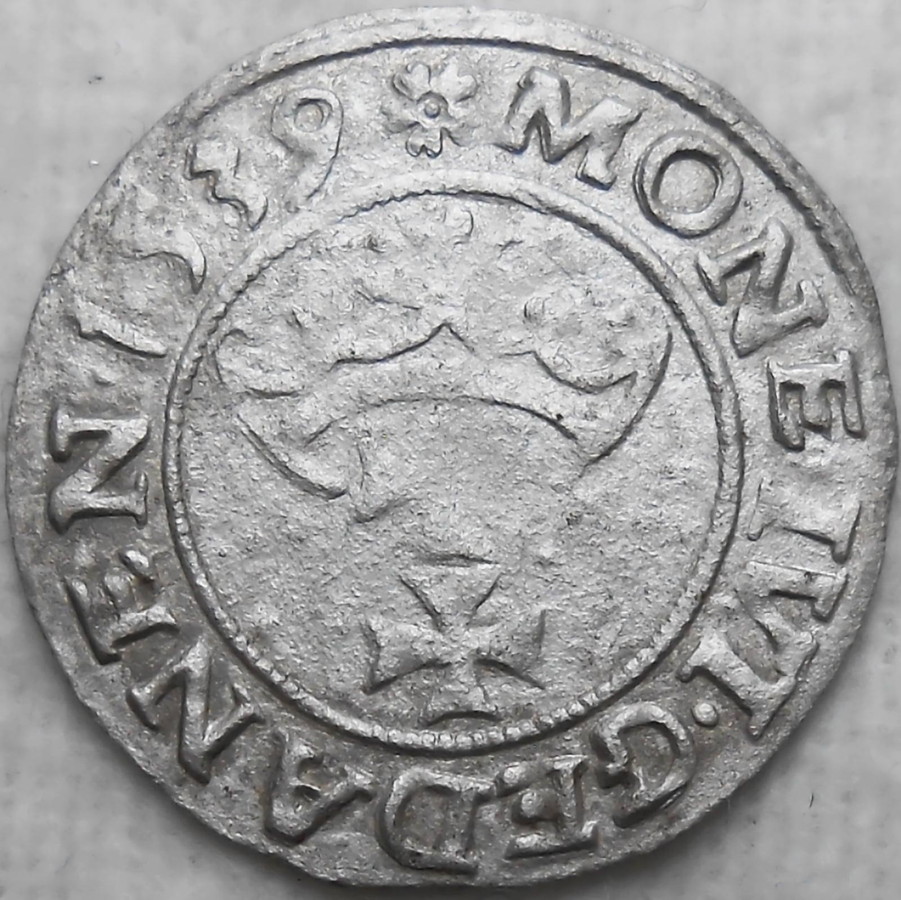 Av.: Herb Prus Królewskich. Napis w otoku: SIGIS DEI GRA REX POLO. U góry w otoku skrzyżowane haki mennicze. Rv.: Mały herb Gdańska (typ 1). Napis: MONE CIVI GEDANEN 1539. Na górze w otoku kwiatek. Moneta srebrna; średnica ok. 20 mm; waga 1,03 g; mennica Gdańsk. Kop. 7282; Kur. 1 – 423, R; Gum. G. 482