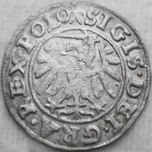 Av.: Orzeł w tarczy, nad tarczą korona. Napis w otoku: SIGMVND D G R POLO. U góry w otoku gwiazdka. Rv.: Mały herb Gdańska w tarczy. Napis w otoku: CIVITAS DANSCZ 1525. Na górze w otoku krzyż kawalerski. Moneta srebrna; średnica ok. 19 mm; waga 1,11 g; mennica Gdańsk. Kop. 7263, R4; Kur. 1 – 399, R3; Gum. G. 446