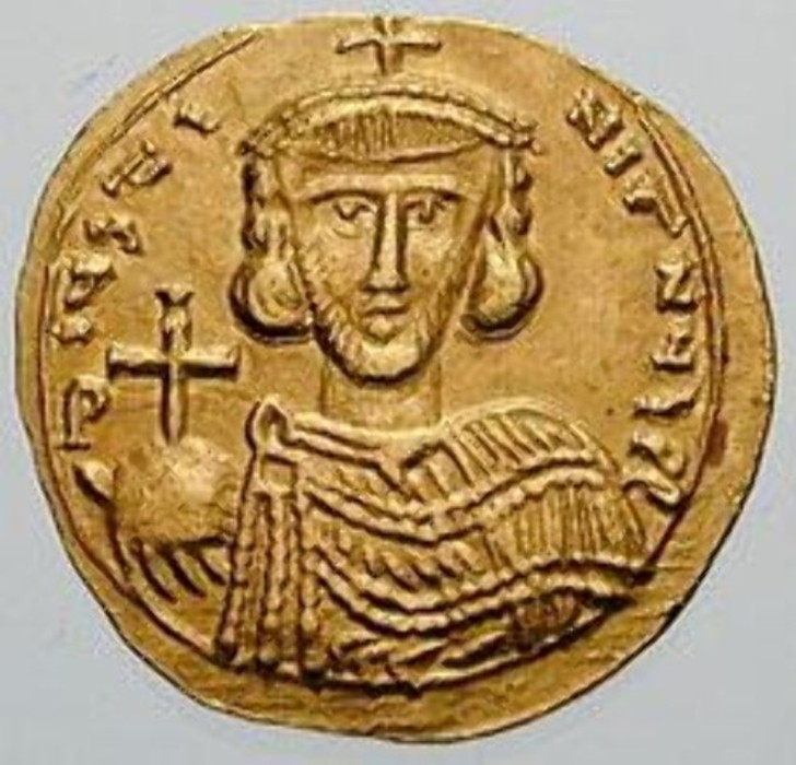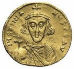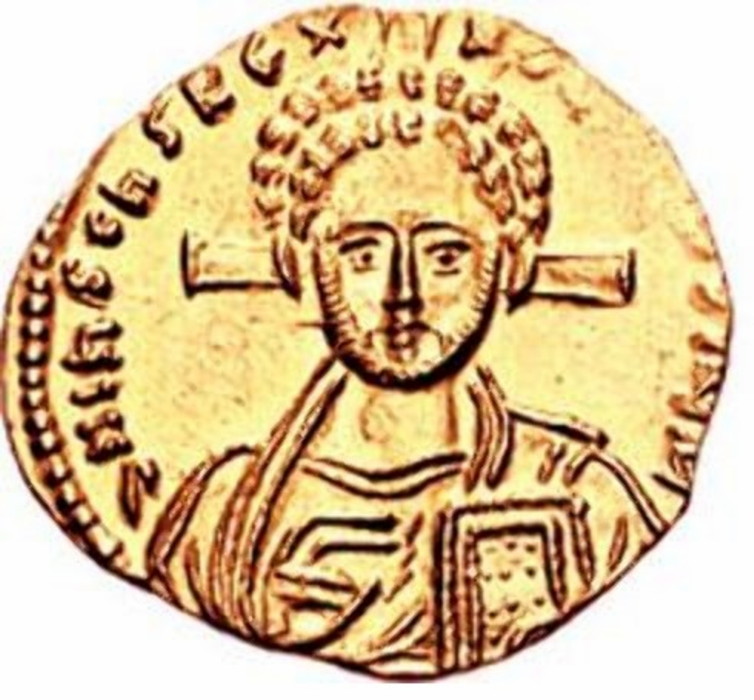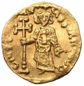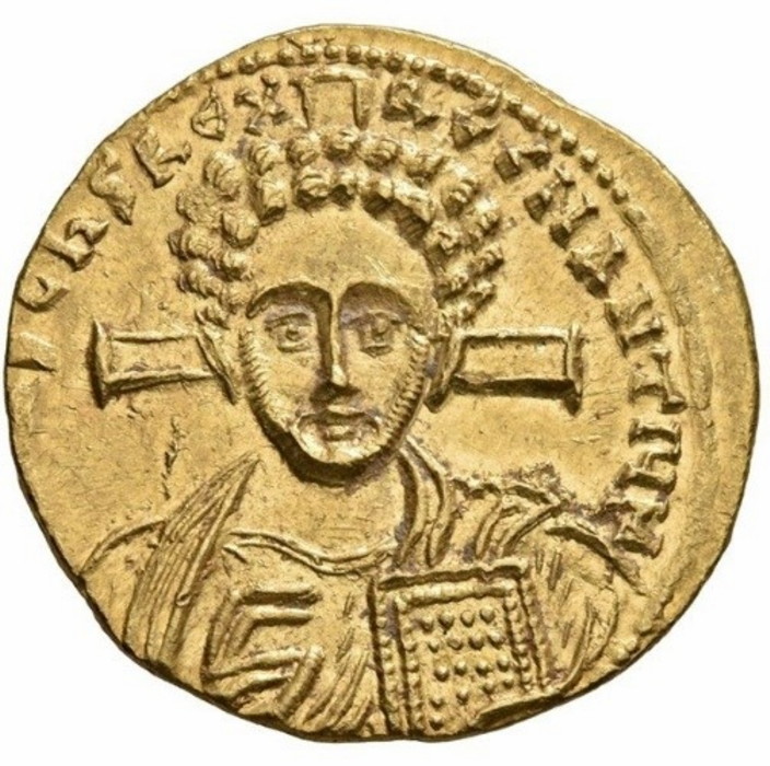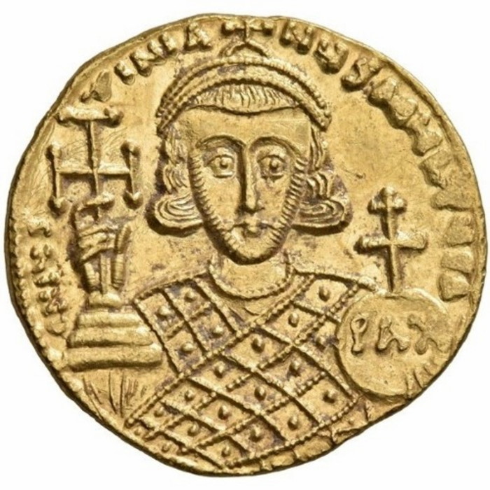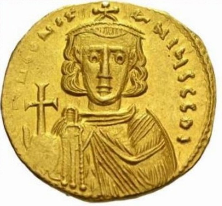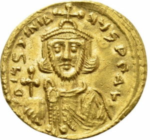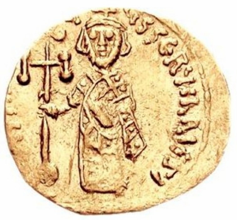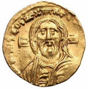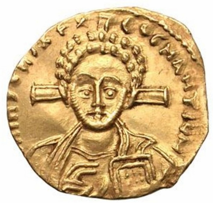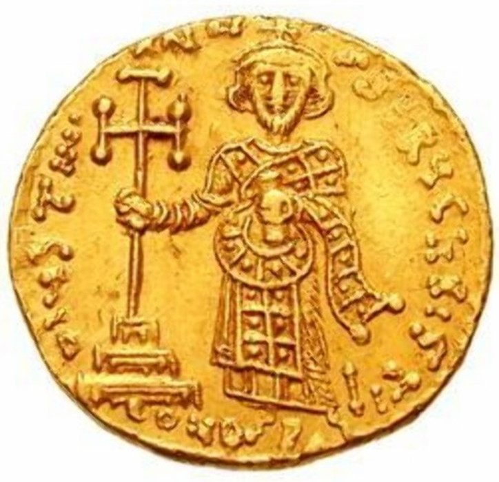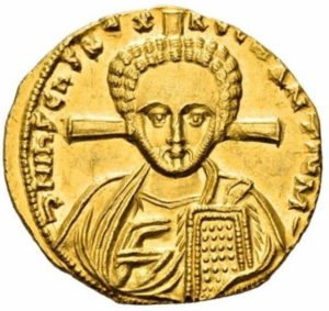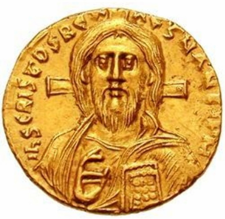 W roku 692 po raz pierwszy w historii pieniądza Jezus Chrystus pojawił się jako postać pierwszoplanowa na awersie monety. Jego wizerunek, jak się przypuszcza, był inspirowany słynną ikoną umieszczoną na bramie „Spiżowej” cesarskiego pałacu w Konstantynopolu. Chrystus został ukazany na tle krzyża, błogosławi prawą dłonią, a w lewej trzyma Biblię. Wokół popiersia znajduje się napis otokowy: IhS CRISTOS REX REGNANTIЧM, czyli Jezus Chrystus, Król królów.