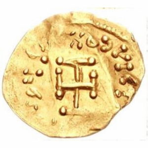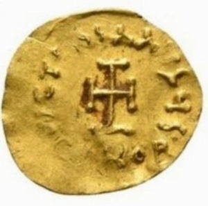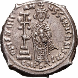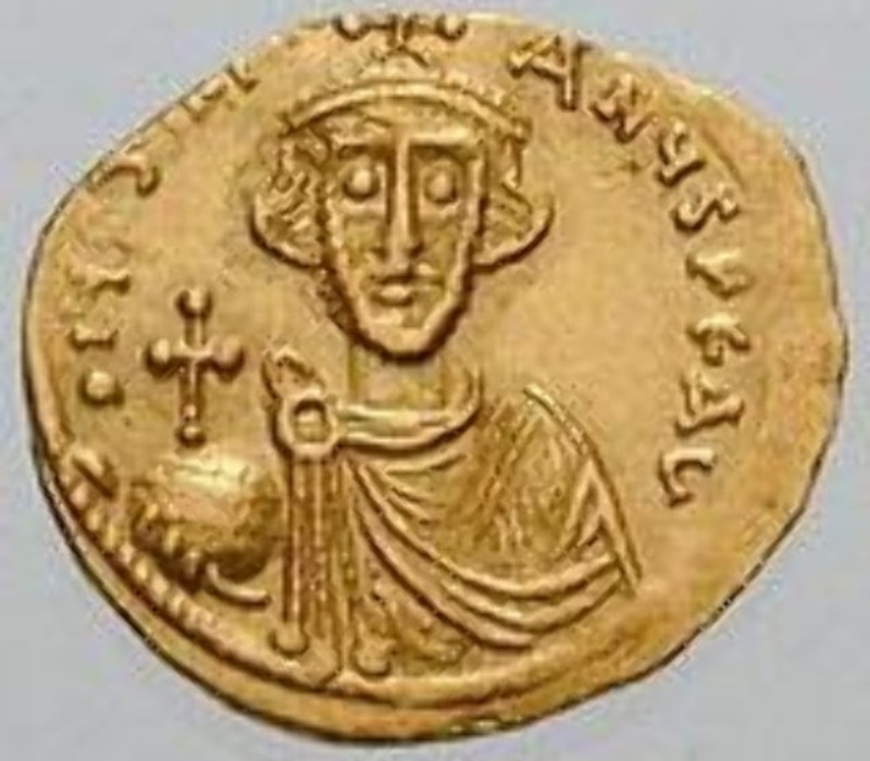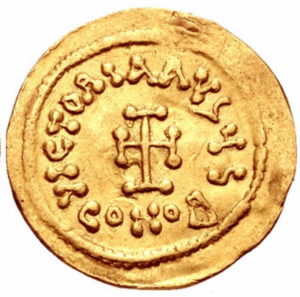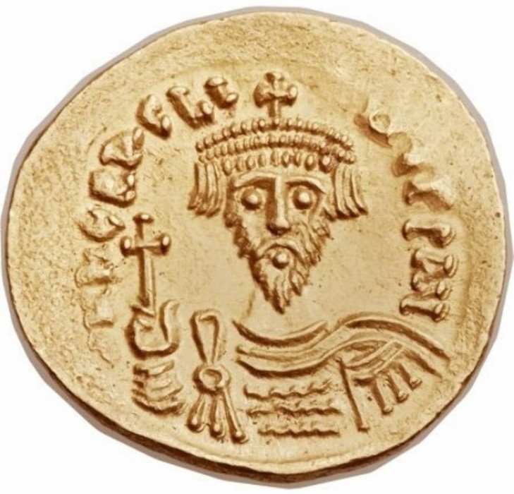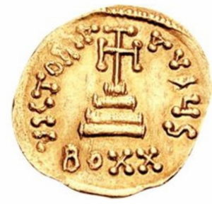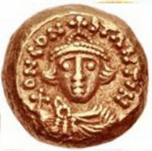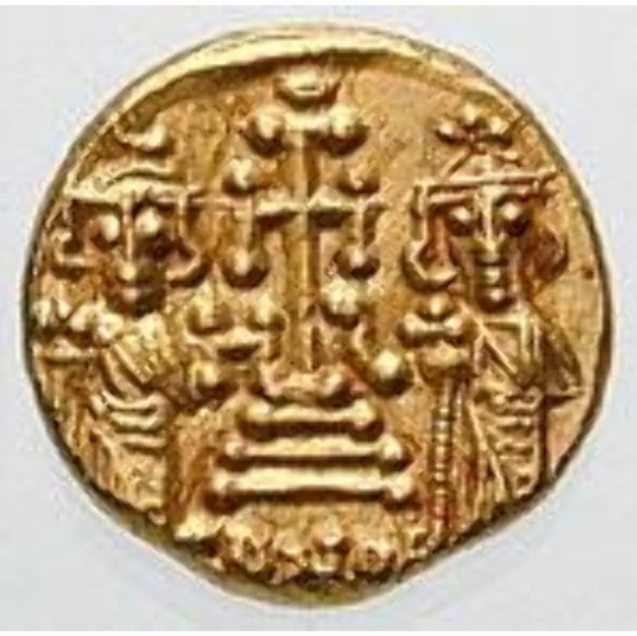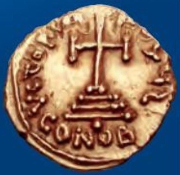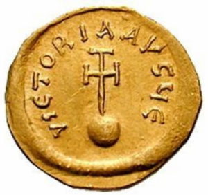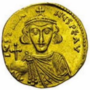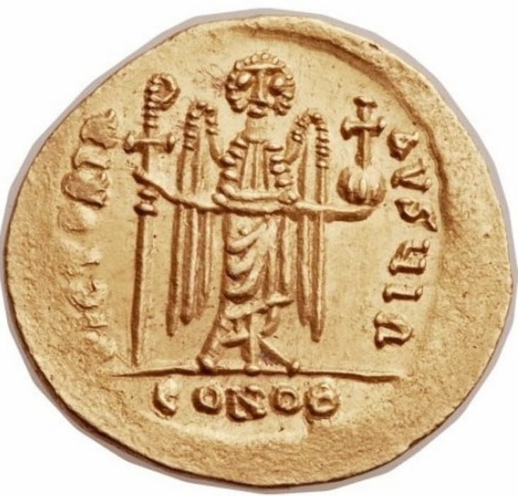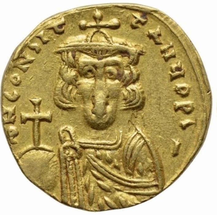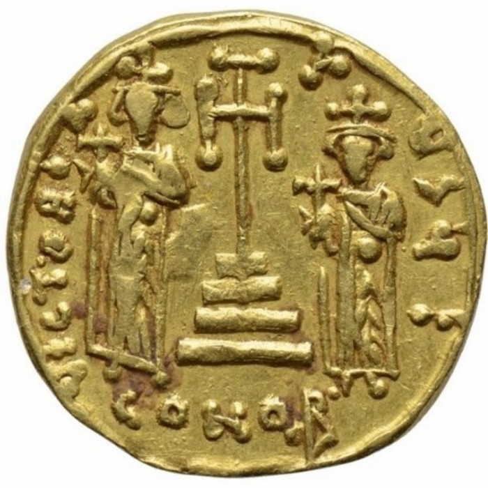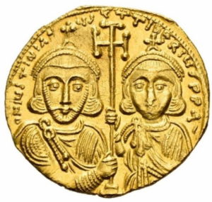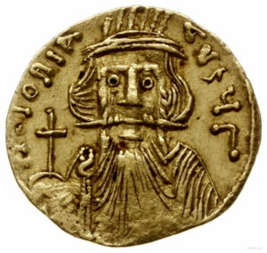 W roku 692 po raz pierwszy w historii pieniądza Jezus Chrystus pojawił się jako postać pierwszoplanowa na awersie monety. Jego wizerunek, jak się przypuszcza, był inspirowany słynną ikoną umieszczoną na bramie „Spiżowej” cesarskiego pałacu w Konstantynopolu. Chrystus został ukazany na tle krzyża, błogosławi prawą dłonią, a w lewej trzyma Biblię. Wokół popiersia znajduje się napis otokowy: IhS CRISTOS REX REGNANTIЧM, czyli Jezus Chrystus, Król królów.