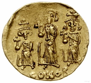 - profil Justyniana/ krzyż na kuli (rysunek charakterystyczny dla semisa ale waga odpowiadająca tremisowi)