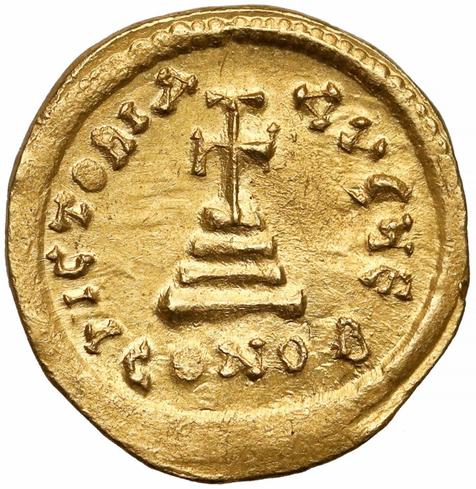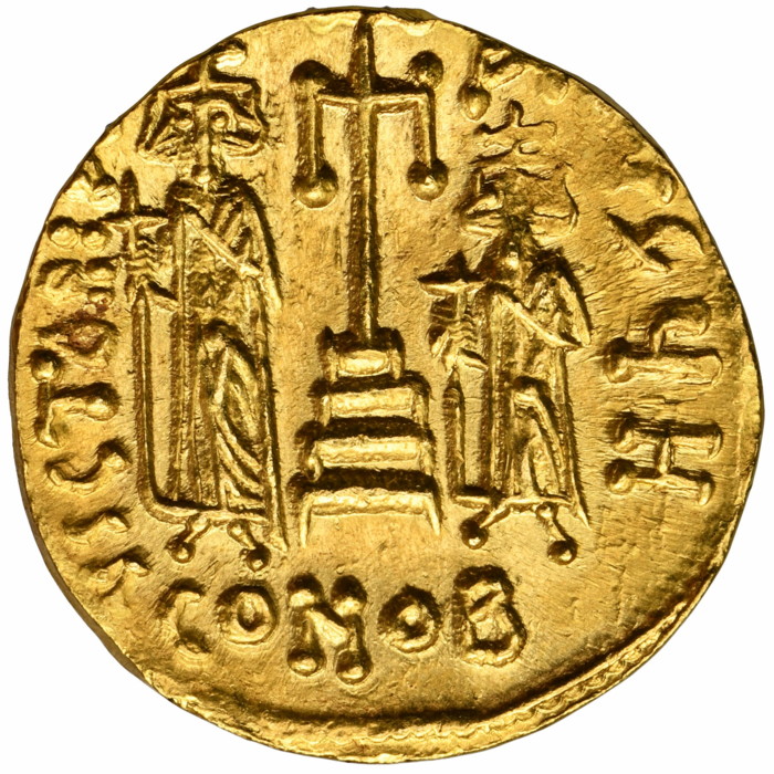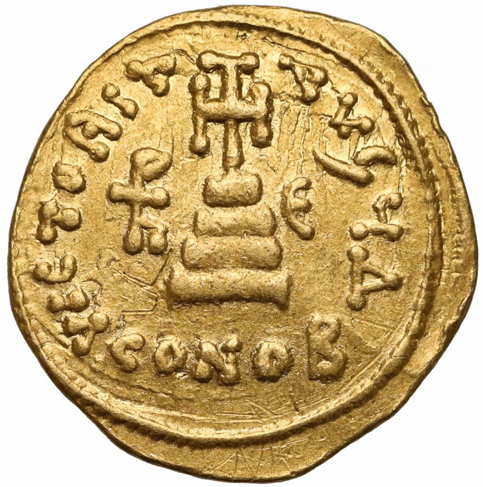 - popiersie cesarza trzymającego kulę z krzyżem, inne napisy/ popiersia Herakliusza i Tyberiusza po bokach krzyża kalwaryjskiego, brak napisu otokowego