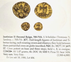 Ćwierćsolid Justynian II, fot. Stack’s, Moneta Imperii Romani Byzantini, January 12, 2009, New York
