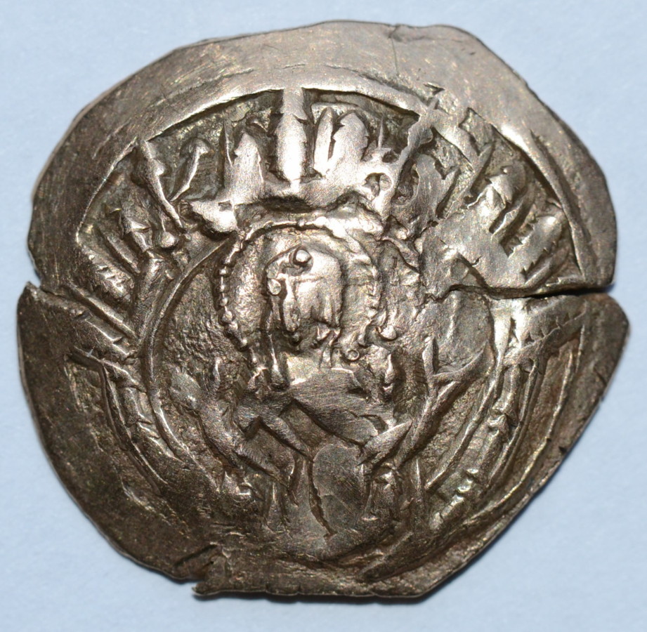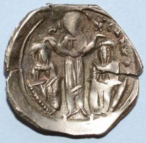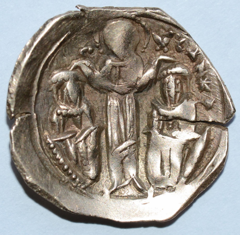 Av.: Matka Boska orantka (z uniesionymi w modlitwie rękami) w obrębie murów Konstantynopola. Rv.: Chrystus błogosławiący dwóch cesarzy (po bokach) – Andronika II oraz jego wnuka (współcesarza) Andronika III. Po bokach głowy Chrystusa litery (IC) – XC, poniżej po prawej stronie litery AN (początek imienia Andronika III) *. Sommer 81.1; Sear 2461; średnica 20-22 mm; waga 2,96 g