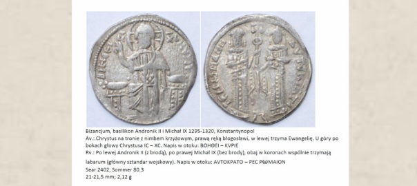Av.: Chrystus na tronie z nimbem krzyżowym, prawą ręką błogosławi, w lewej trzyma Ewangelię. U góry po bokach głowy Chrystusa IC – XC. Napis w otoku: BOHΘEI – KVPIE. Rv.: Po lewej Andronik II (z brodą), po prawej Michał IX (bez brody), obaj w koronach wspólnie trzymają labarum (główny sztandar wojskowy). Napis w otoku: ΑVΤΟΚΡΑΤO – PEC PωMAION. Sear 2402; Sommer 80.3; 21-21,5 mm; 2,12 g