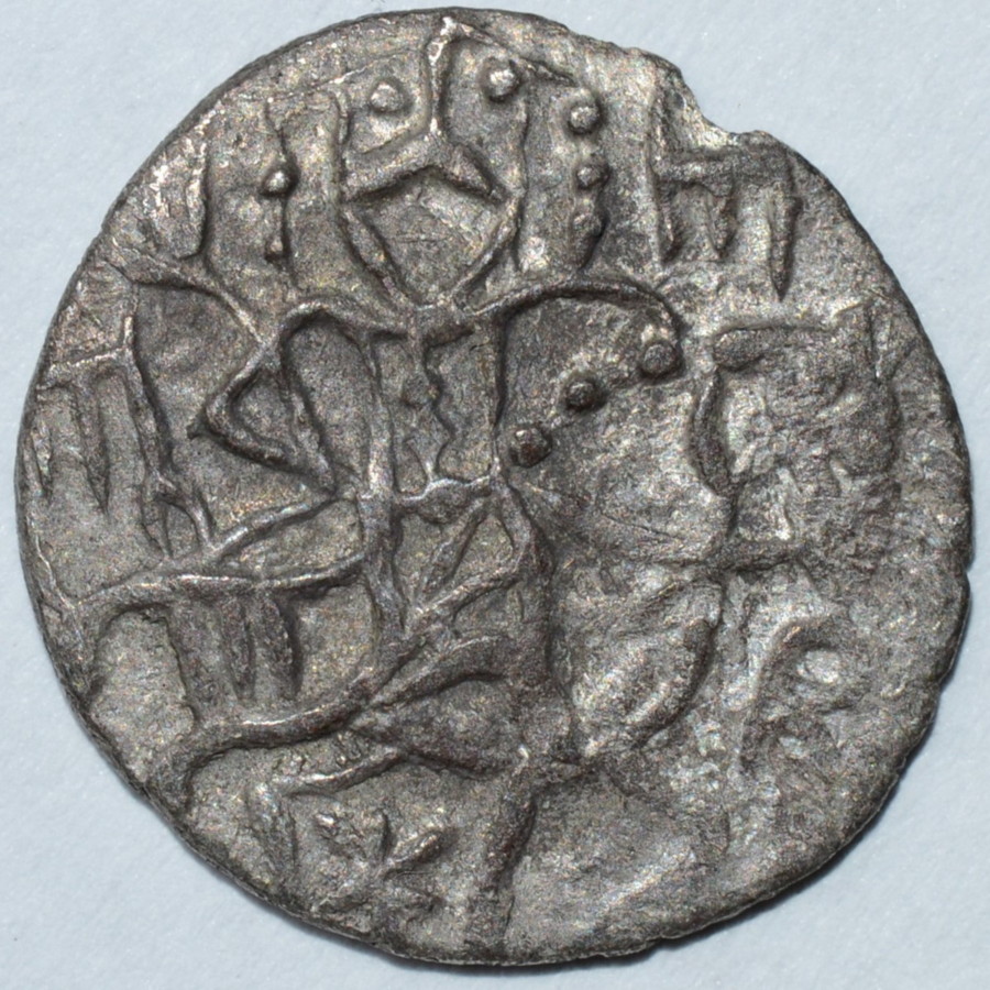 Av.: Święty Eugeniusz z nimbem wokół głowy, jadący na koniu w prawo i trzymający krzyż w prawej ręce, u dołu roślina. Napis: O z literą A wewnątrz ЄV/ NH