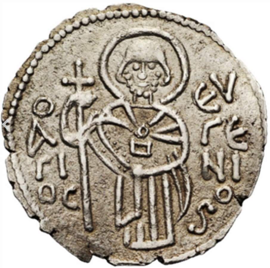 Av.: Święty Eugeniusz stojący na wprost, z nimbem wokół głowy, z długim krzyżem w prawej ręce. W polu monety napis: O z literą A wewnątrz ЄV/ ΓЄ(NIOC)